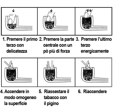 Accendere più volte, ogni volta Compattando bene il tabacco che si solleva con il calore. Accendere su tutta la superficie fino a quando il tabacco non Si solleverà Più.